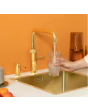 The Quooker is available as Fusion Square and Fusion Round, i.e. as a mixer tap with a streamlined straight or decorative round spout. The mixer tap comes in matte gold, which gives the tap a subtle accent. The matching soap dispenser is also available in gold plate. The Quooker Gold is supplied with PRO3, PRO7or a COMBI tank which goes under the worktop.